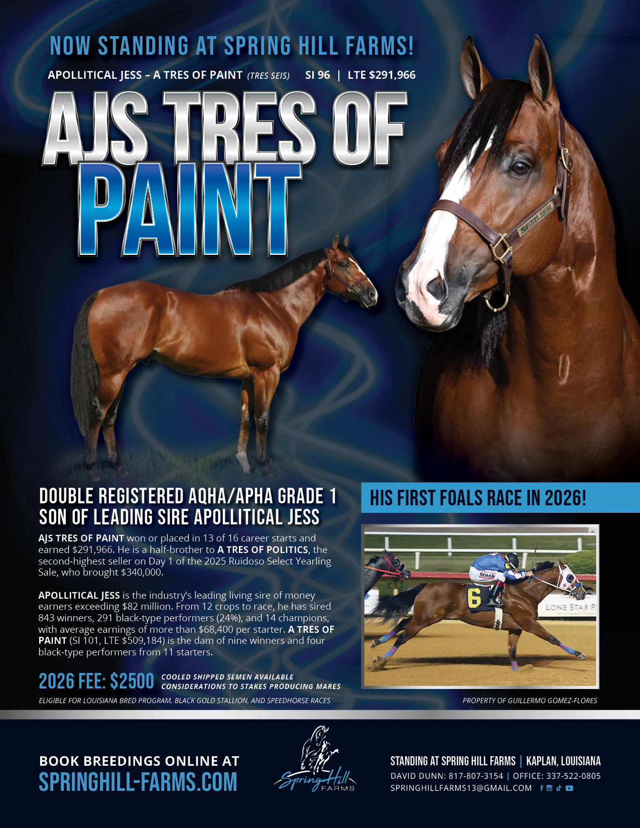 AJS TRES OF PAINT won or placed in 13 of 16 career starts and earned $291,966. He is a half-brother to A TRES OF POLITICS, the second-highest seller on Day 1 of the 2025 Ruidoso Select Yearling Sale, who brought $340,000.